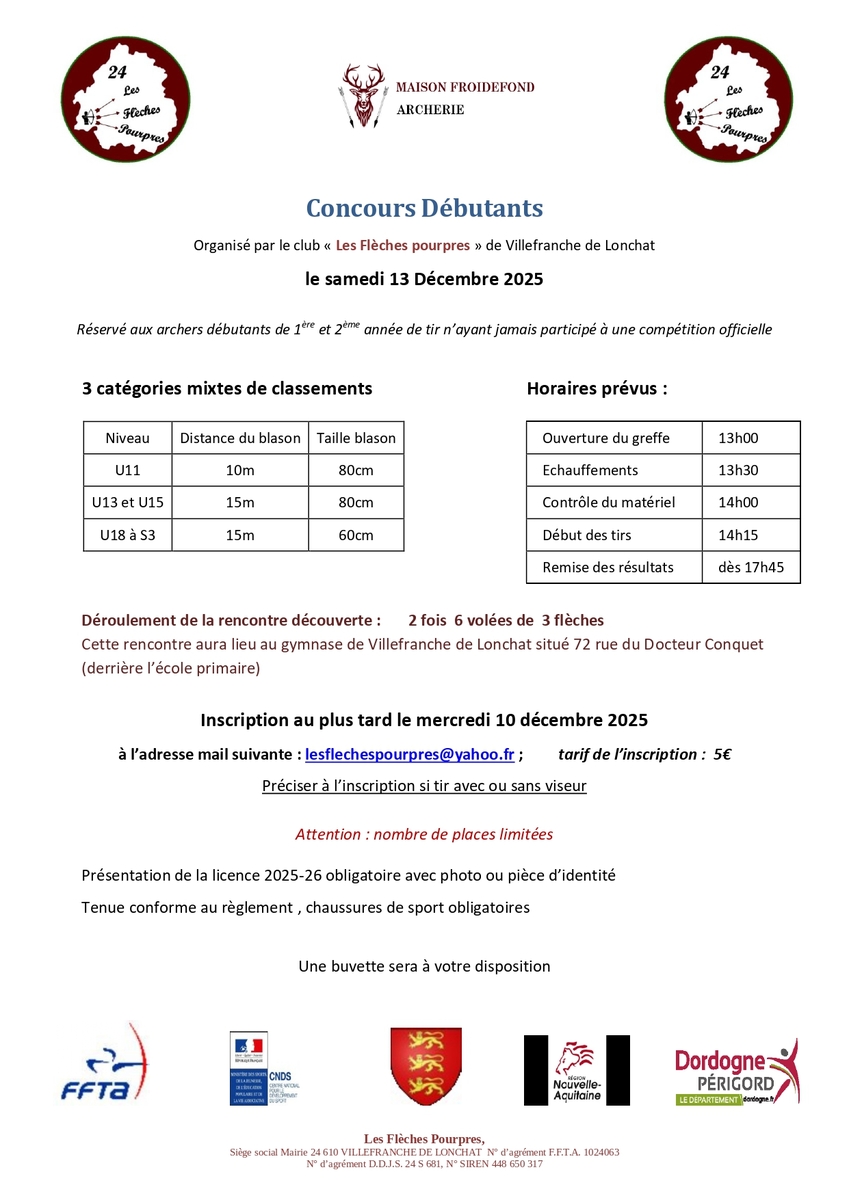 Les Flèches pourpres organisent un concours loisir pour les débutants le samedi 13 décembre 2025 à Villefranche de Lonchat. Le mandat est disponible sur notre page "Mandats & Résultats" !